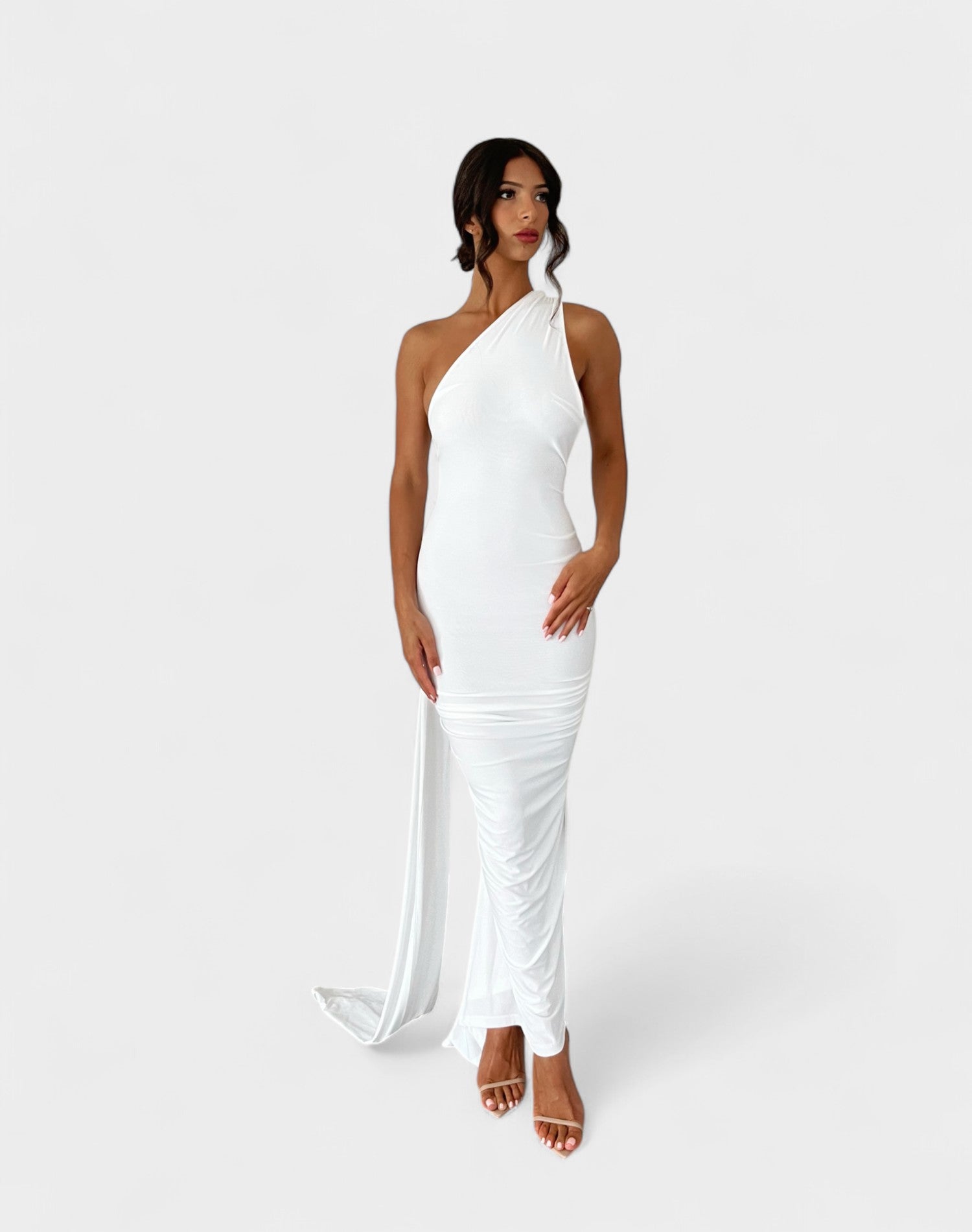 Make a statement with the Sia One-Shoulder Ruched Maxi Dress. Designed with a bold one-shoulder neckline and flattering ruched details, this dress perfectly combines elegance with an edgy twist. Perfect for any formal event or romantic evening.