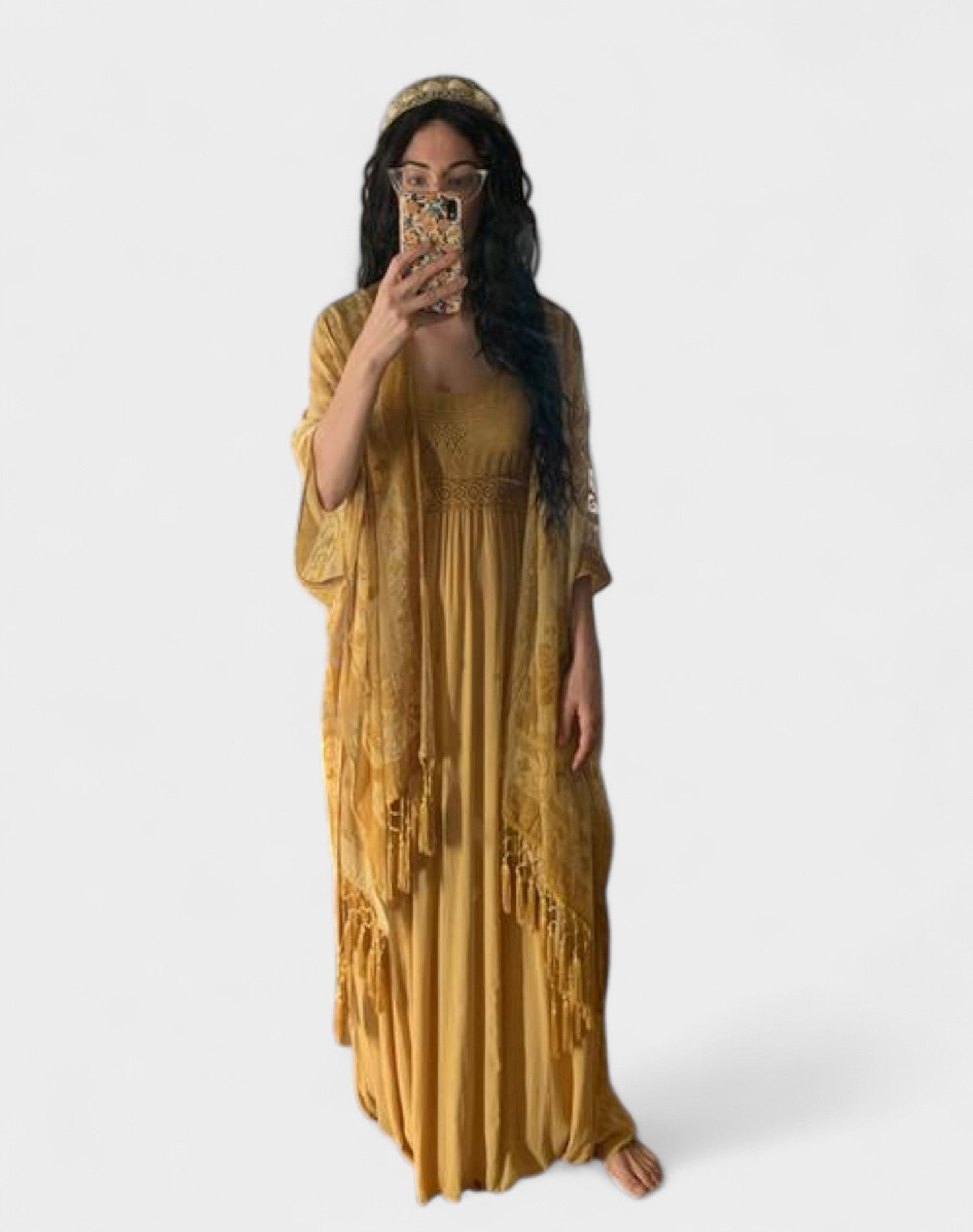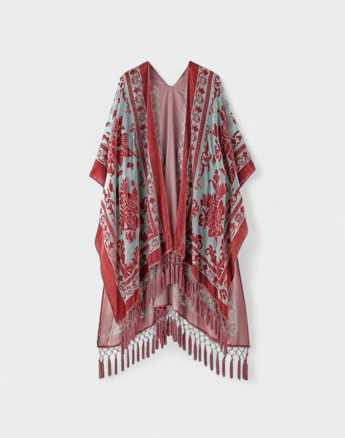 The Sofia Boho Floral Kimono brings a touch of free-spirited elegance to any outfit. Designed with a flowing, open silhouette and intricate floral details, it is perfect for layering over your favorite outfits or adding a whimsical touch to your day.